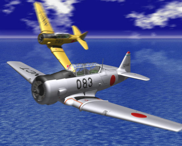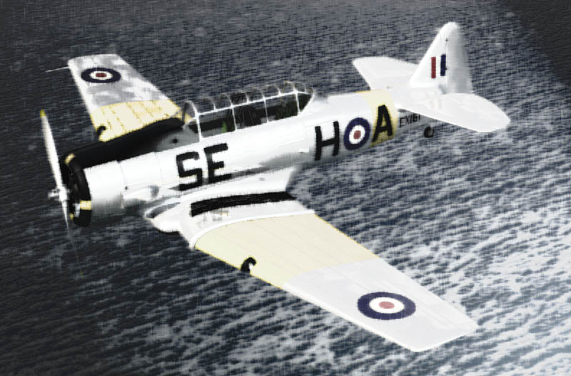 Post-Processed ImageThe left and below images were ray-traced with Flamingo plug-in and filtered with Photoshop. This color scheme was based on RAF, post-war style (SE means 'single engine'). Reused 3D-model of T-6G is slightly differed from the real Harvard Mark II A. |